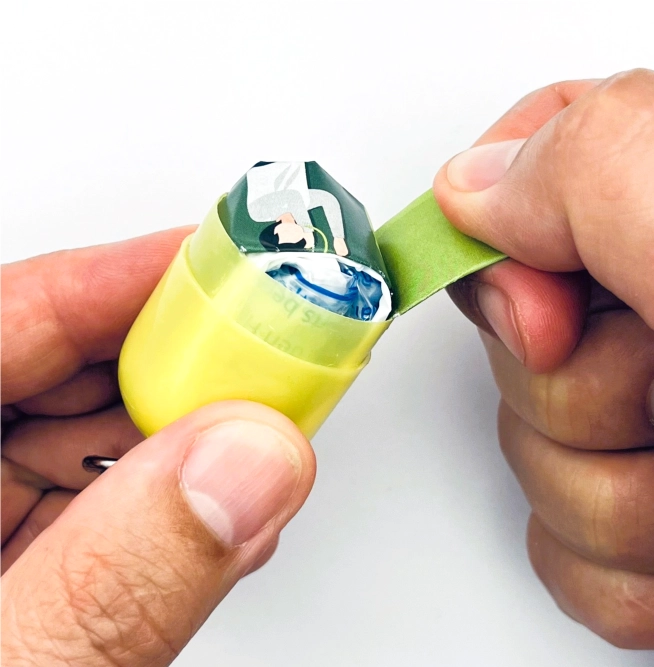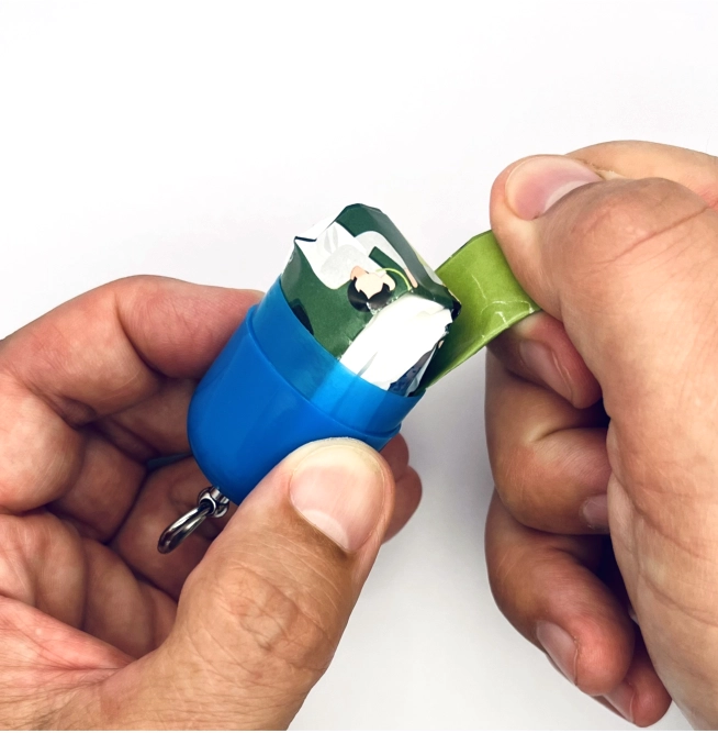 Jeder Notfallkapsel wird in einem Folienbeutel ausgeliefert. Darin befindet sich auch der Informationsflyer mit Angaben zum Schlüsselanhänger wie z.B. dem Inhalt, die Einmalhandschuhgröße, das MHD usw.