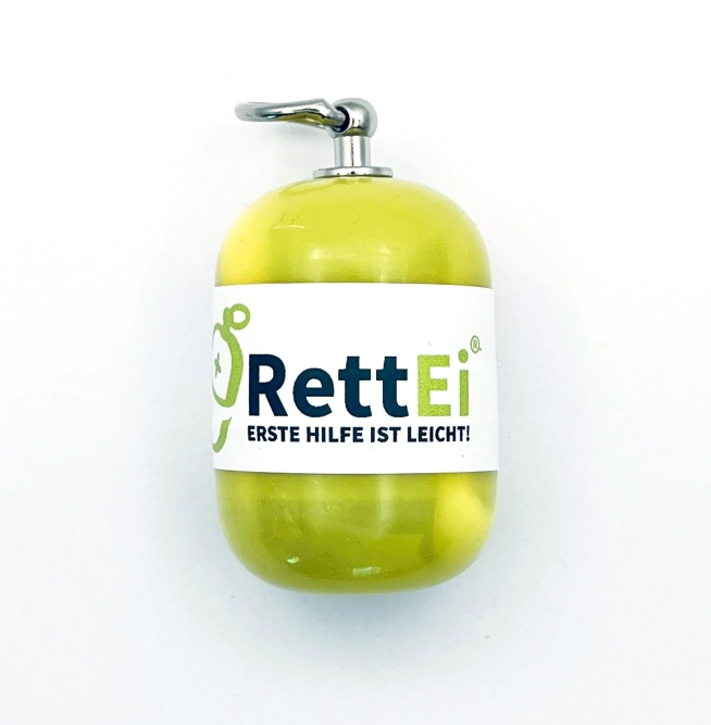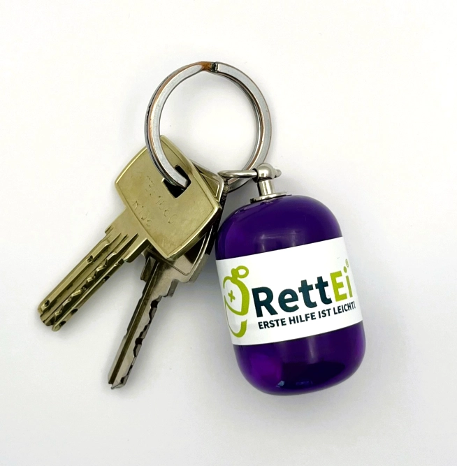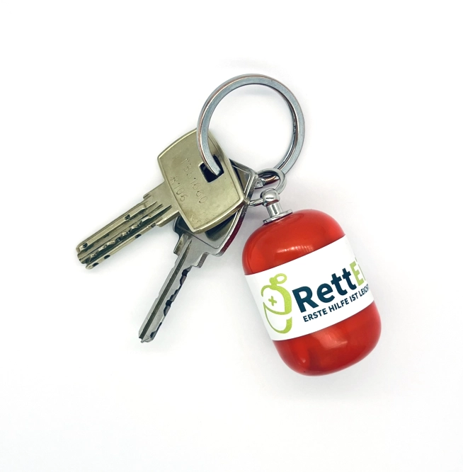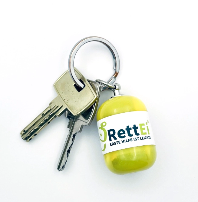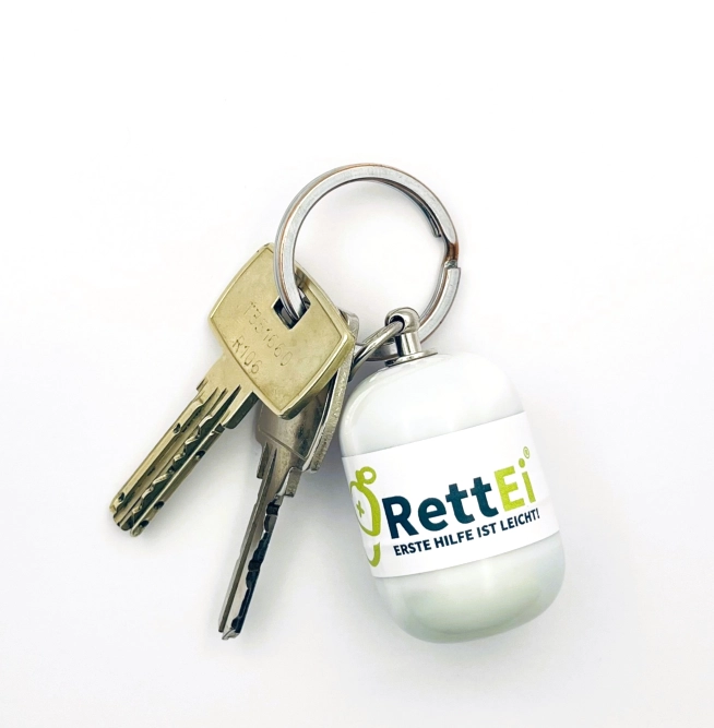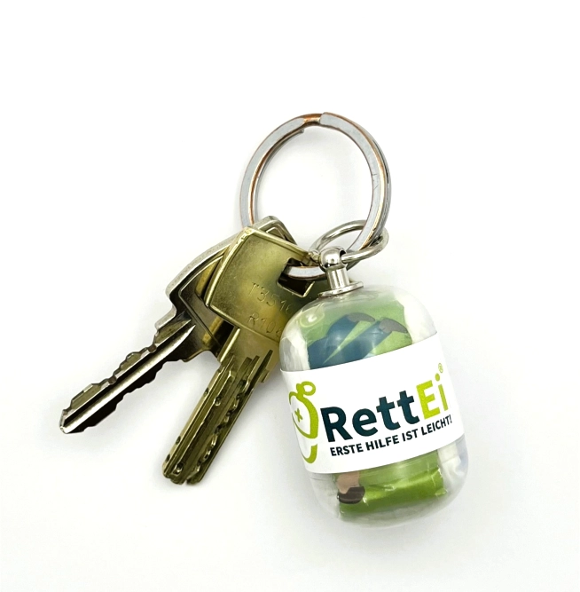 Steigern Sie Ihre Markenpräsenz mit unserer Notfallausstattung im Erste-Hilfe-Schlüsselanhänger – RettEi-Logo, der Kompetenz, Verantwortungsbewusstsein und Innovationsgeist vermittelt.